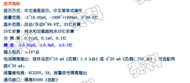 产品概述:产品描述:测量范围0~14pH、温度范围0~80℃;特别适用于电厂脱硫pH值测量。