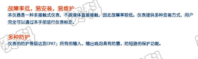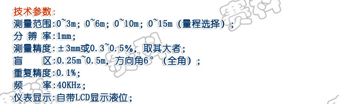 产品概述:产品描述:测量范围:0~3m、0~6m、0~10m、0~15m; 盲区:0.25m~0.6m;重复精度:0.1%;分辨 率:1mm;适用领域:产品广泛适用于石油、化工、水处理、水利、食品、粮食等行业的物位测量。
